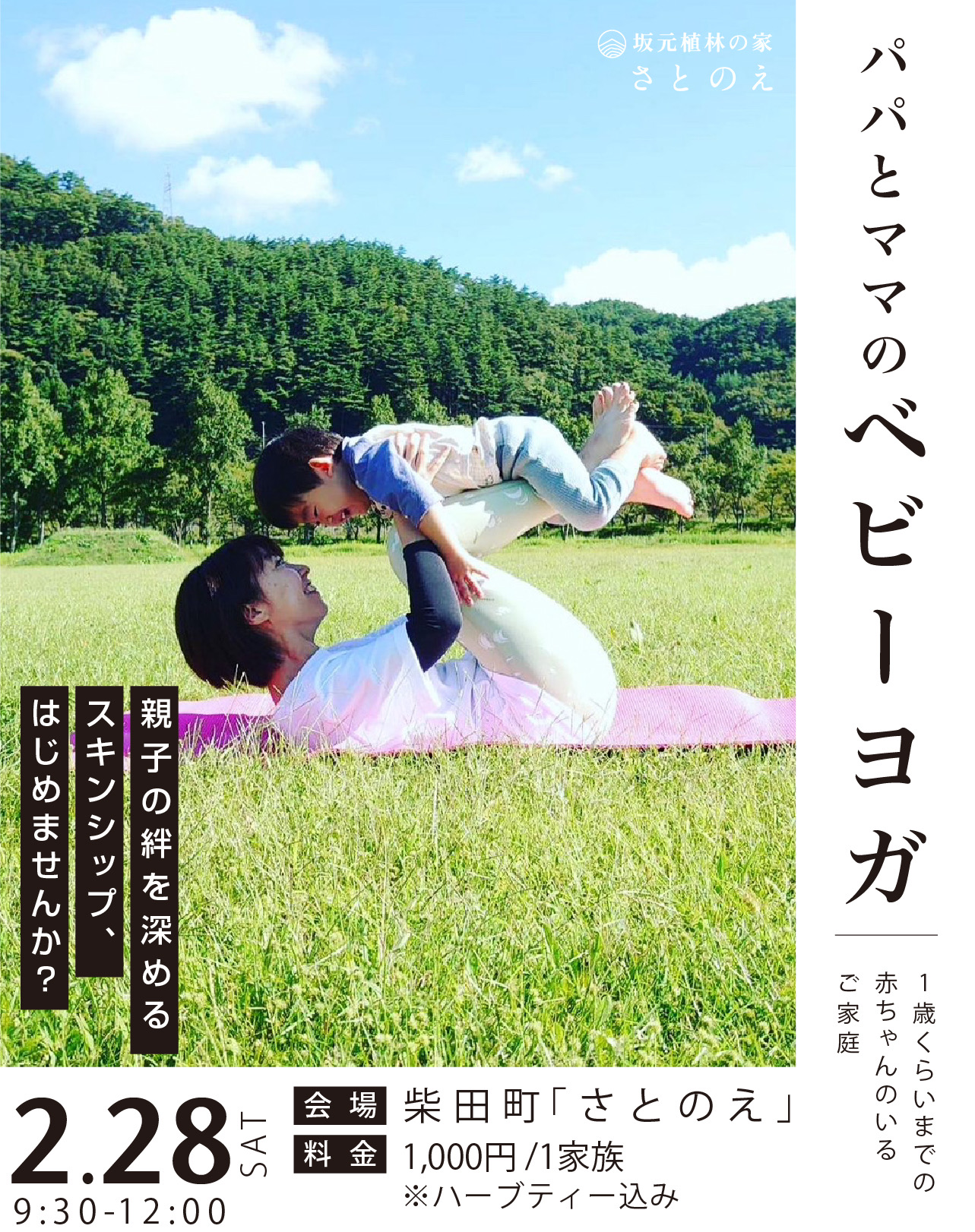 赤ちゃんとパパ・ママが一緒に楽しめる「パパとママのベビーヨガ@さとのえ」を開催します。