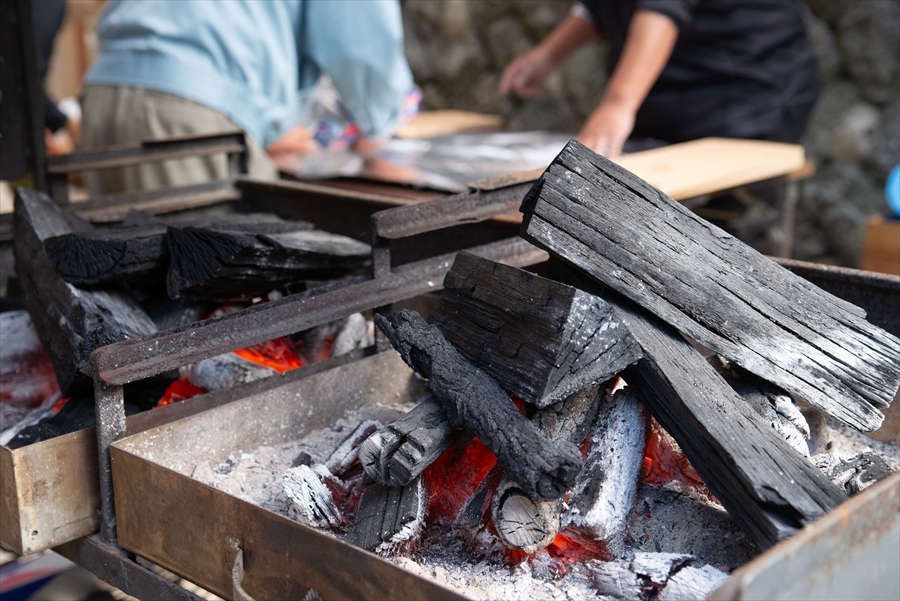 水をかけて消火すると、炭が使えなくなってしまいます。