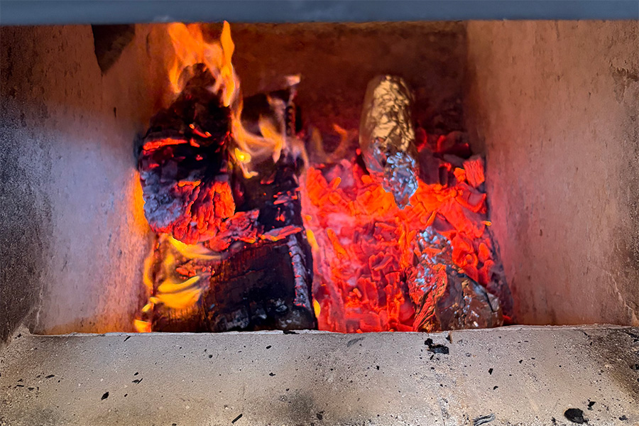 薪や炭が真っ赤に輝きながら遠赤外線を放ち、