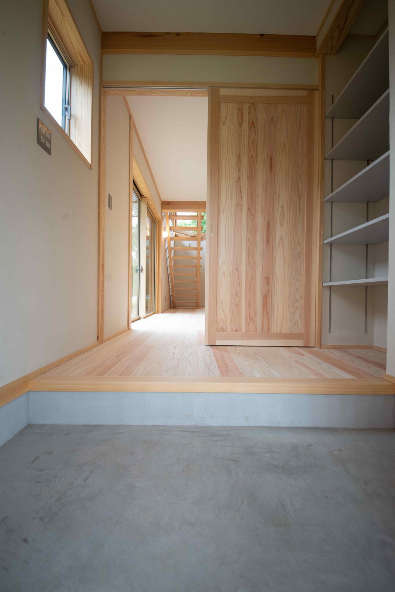 シンプルなコンクリートの土間と木目の床のコントラストが美しい玄関。