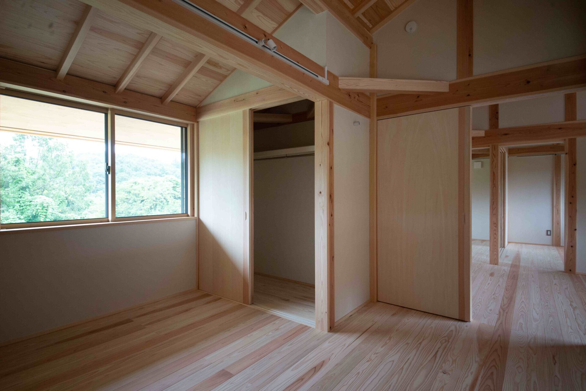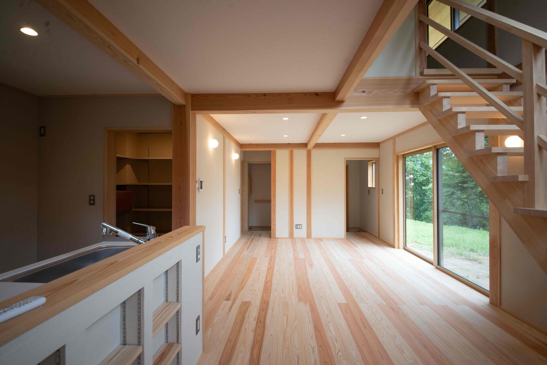 こちらのお宅は、あらかじめ構造や設計に一定のルールを持たせることで、コストを抑えながらも柔軟な間取り提案を実現する坂元植林の家のセミオーダー住宅「きのえ」です。