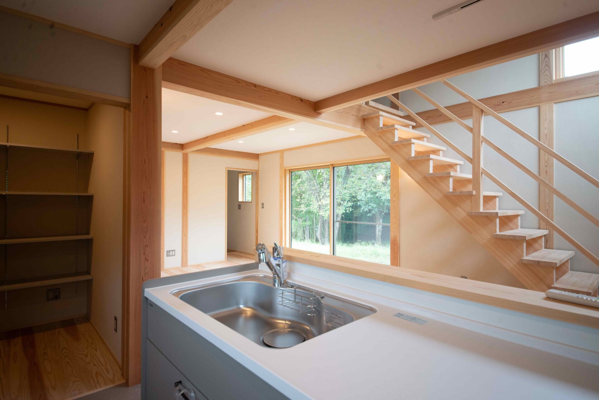 子どもが返ってきたときに顔が見られるように。2階への階段はリビングに配置。