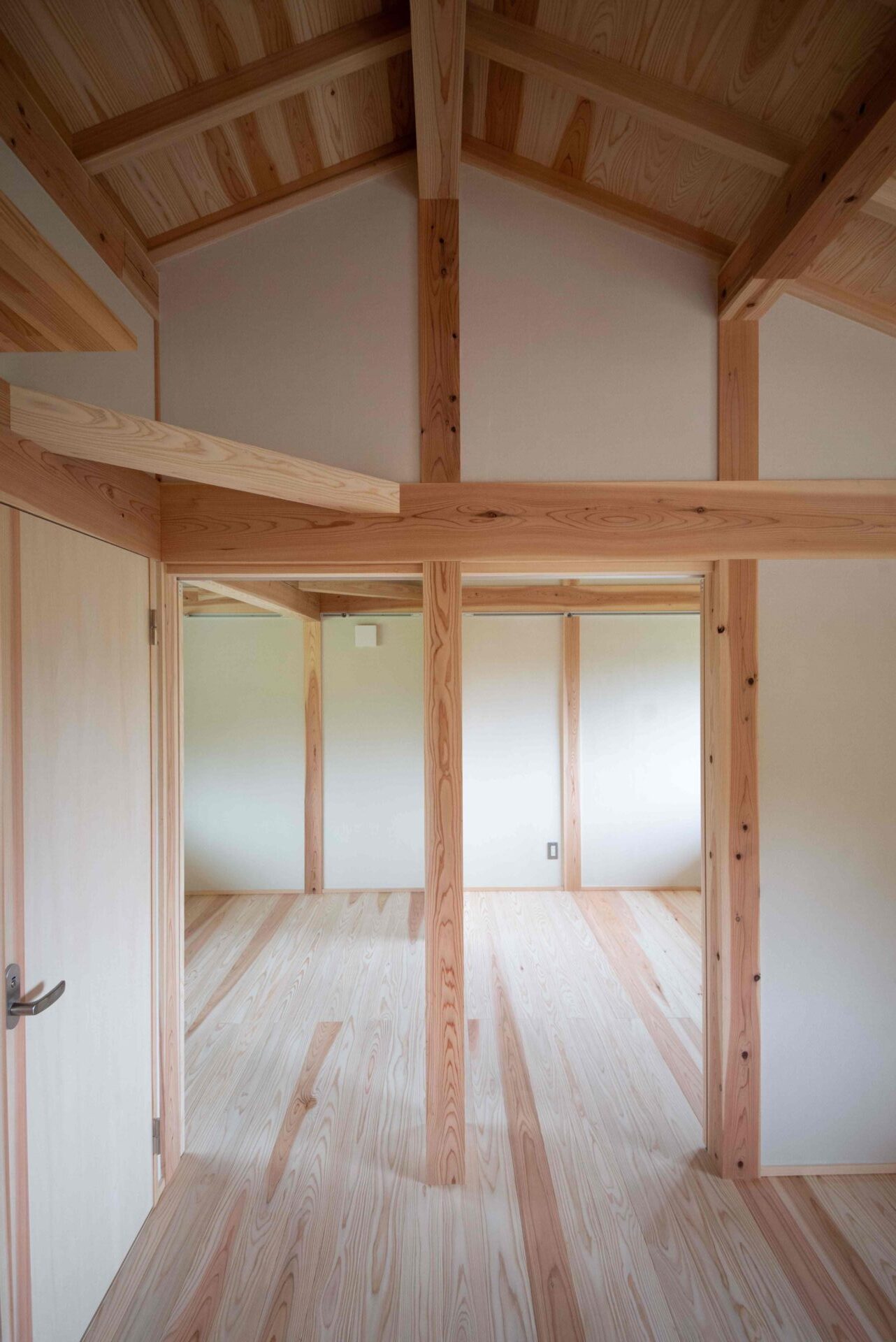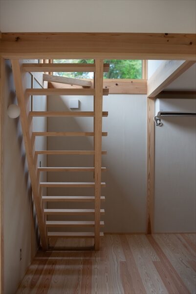 踊り場から子ども部屋の入口です。屋根の垂木が美しい開放的な空間です。