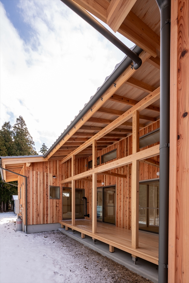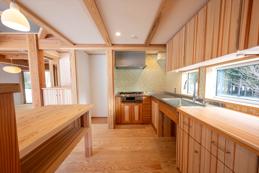 自社の森で育てた木材を用い、秋保の豊かな自然に寄り添うように計画された、長屋形式の平屋の木の家です。25坪の平屋が二棟ゆるやかにつながる構成とし、それぞれの暮らしの距離感を大切にしながら、ひとつながりの大空間と心地よい関係性を生み出しています。