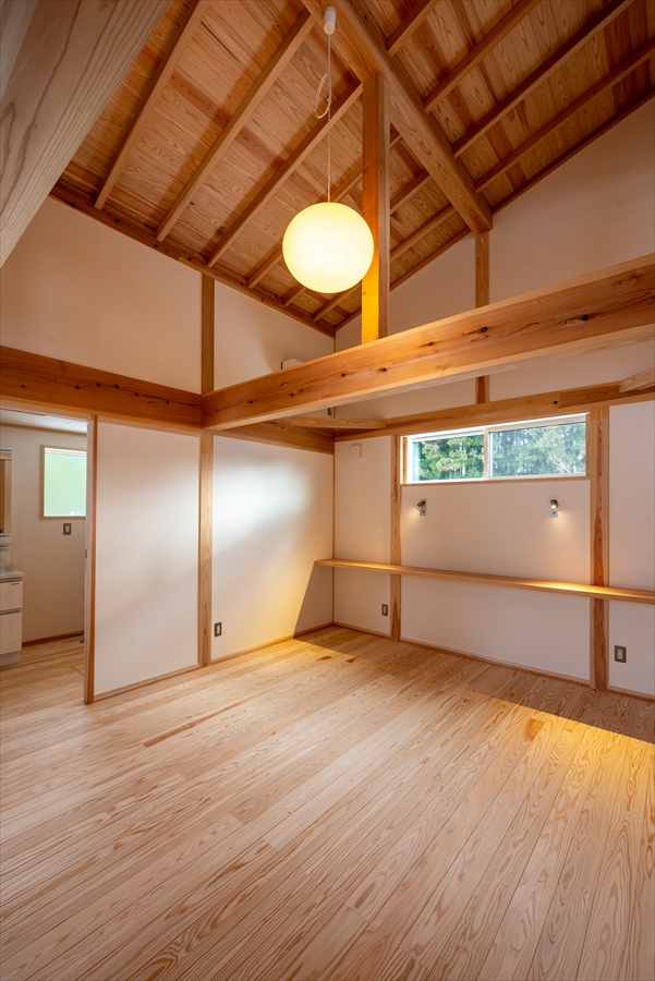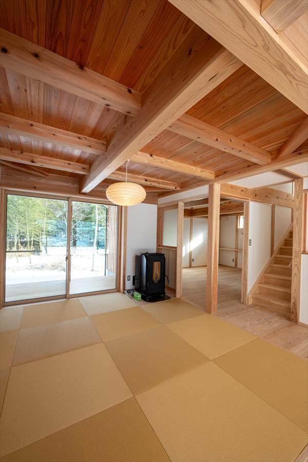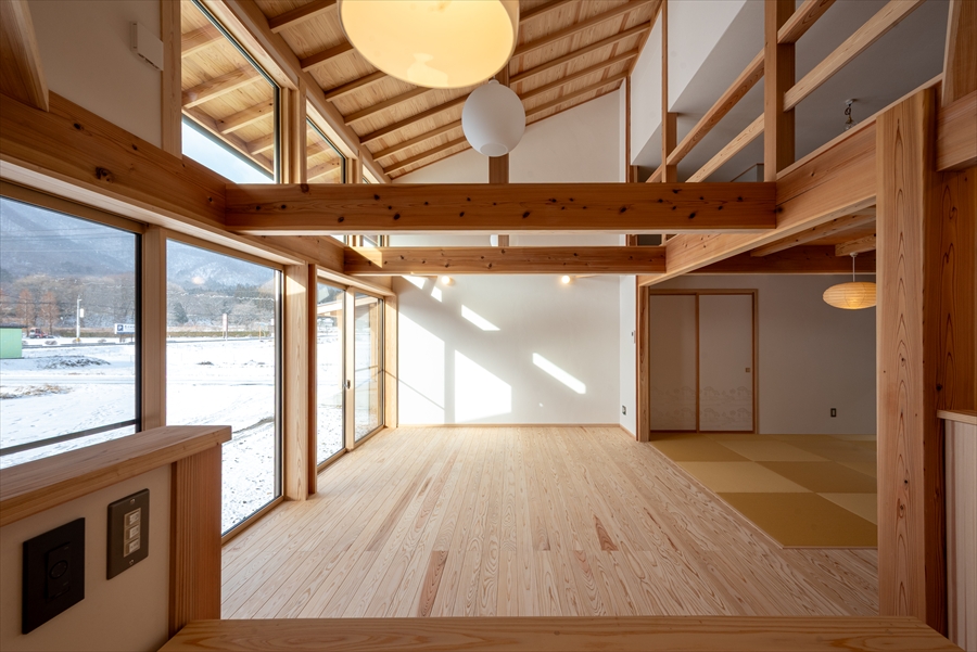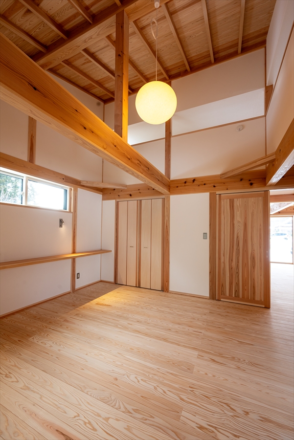 広がりのある吹抜け空間。あらわしの垂木が美しい表情を見せます。