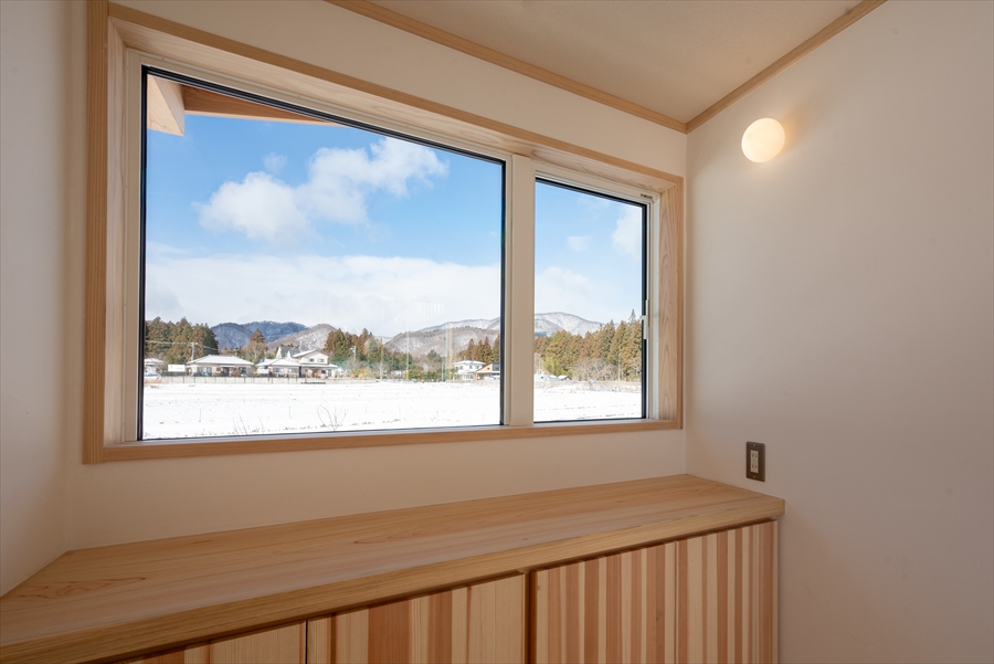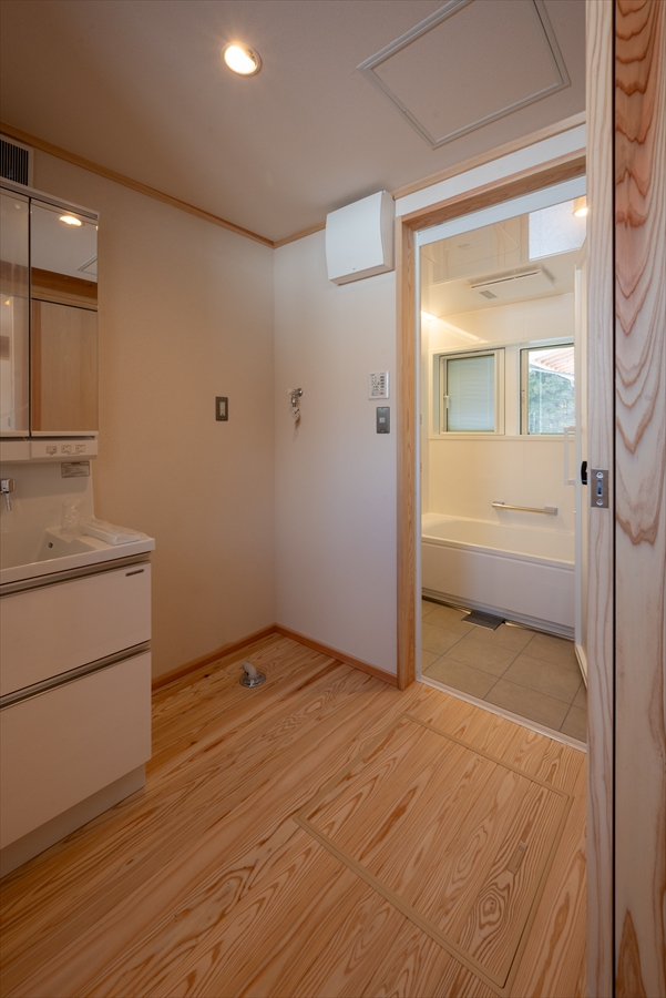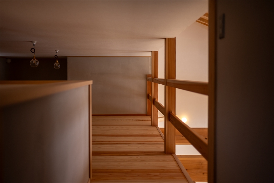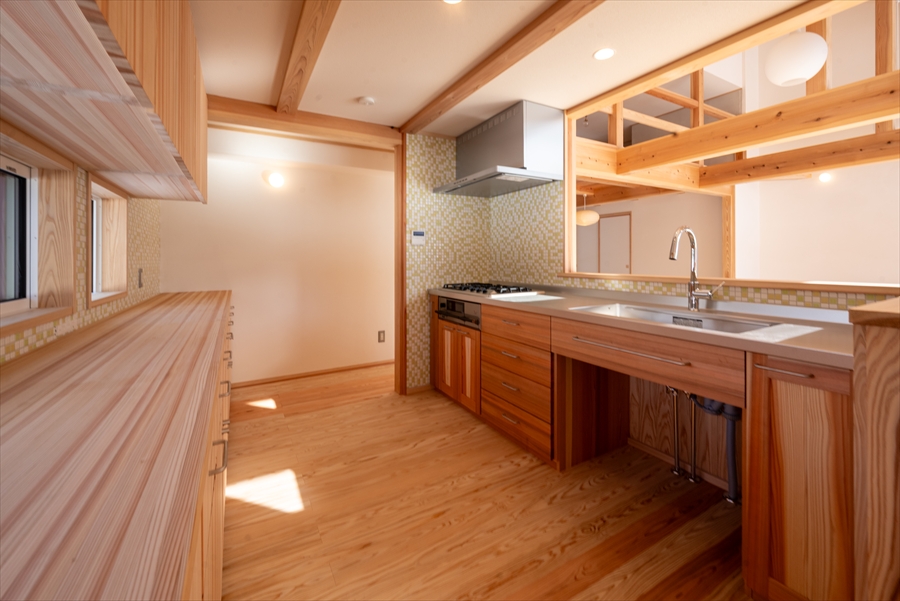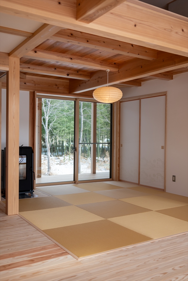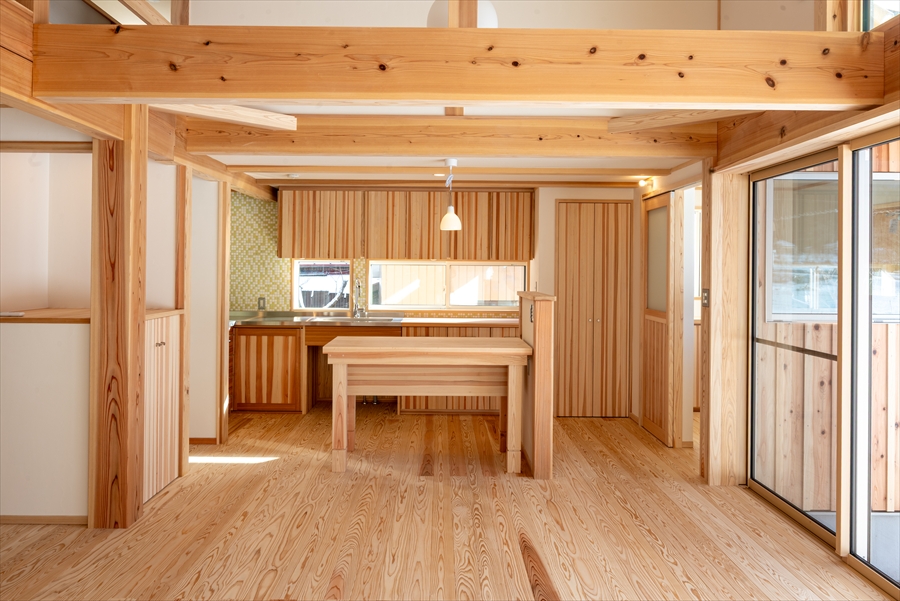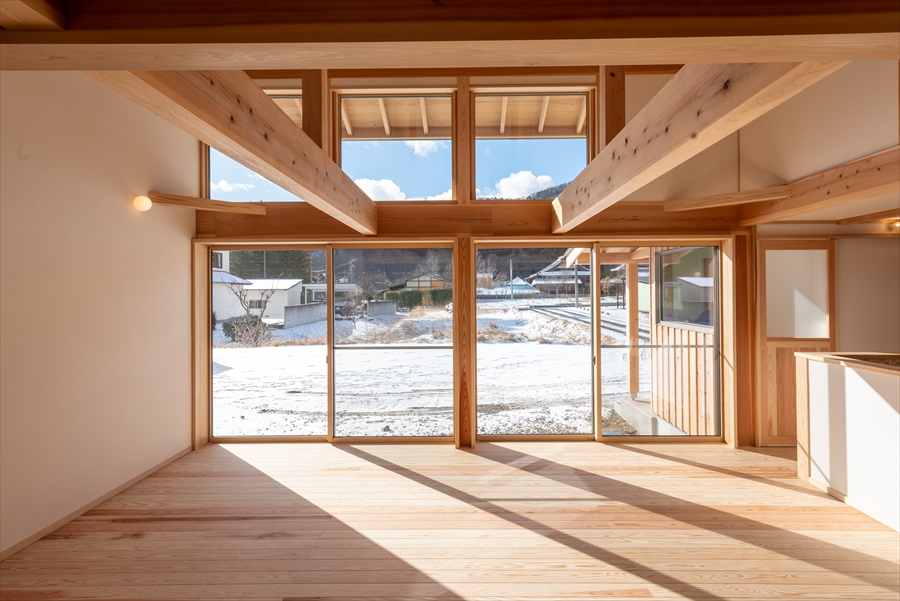 南面の大きな開口からやわらかな自然光を取り込み、北側には竹林の風景が広がるなど、内と外が穏やかにつながる設計としました。真壁づくりの落ち着いた空間と、自社材の梁や無垢材の質感が、自然とともにある豊かな暮らしを支える住まいです。
