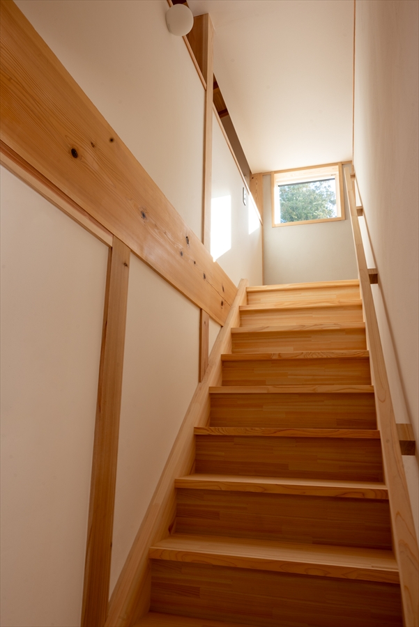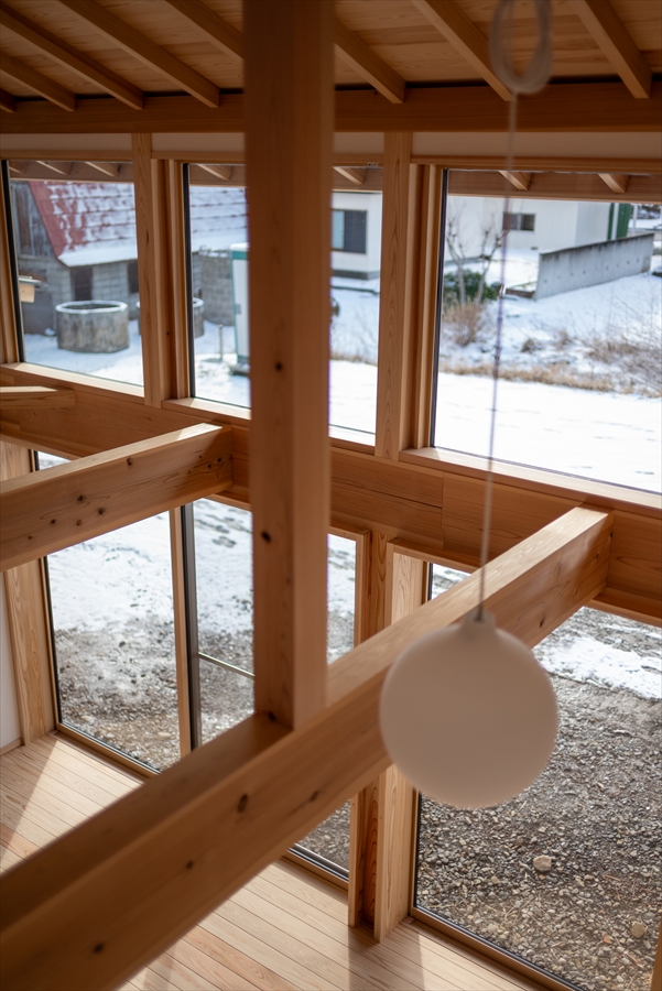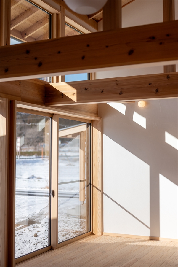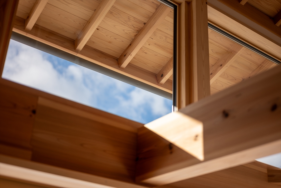住まい手様と共に伐り倒した丸太からつくり上げた梁が、この家をしっかりと、美しく支えています。