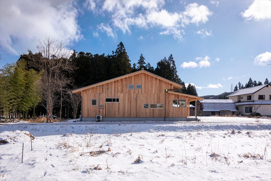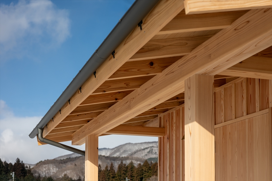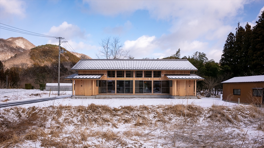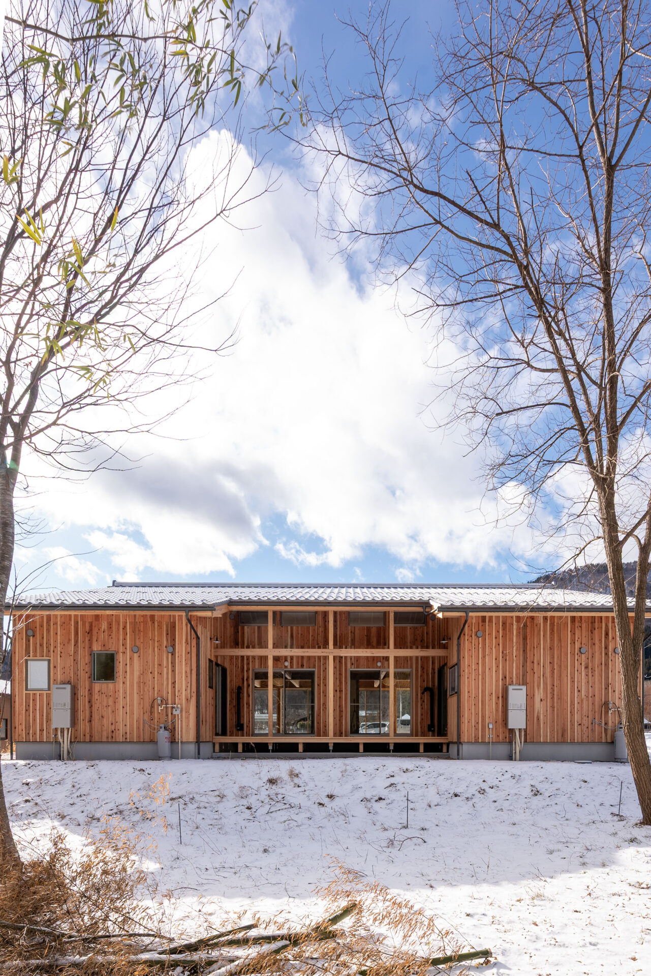 長屋の正面外観。秋保の風景と調和する、無垢材の外壁と瓦屋根が特徴の建築です。